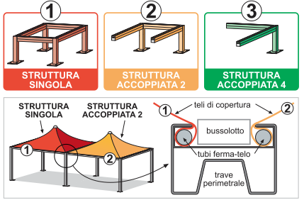 - Chiusure laterali scorrevoli con cerniera (in PVC lucido, opaco, oscurante) e sistema di tensionamento del telo.