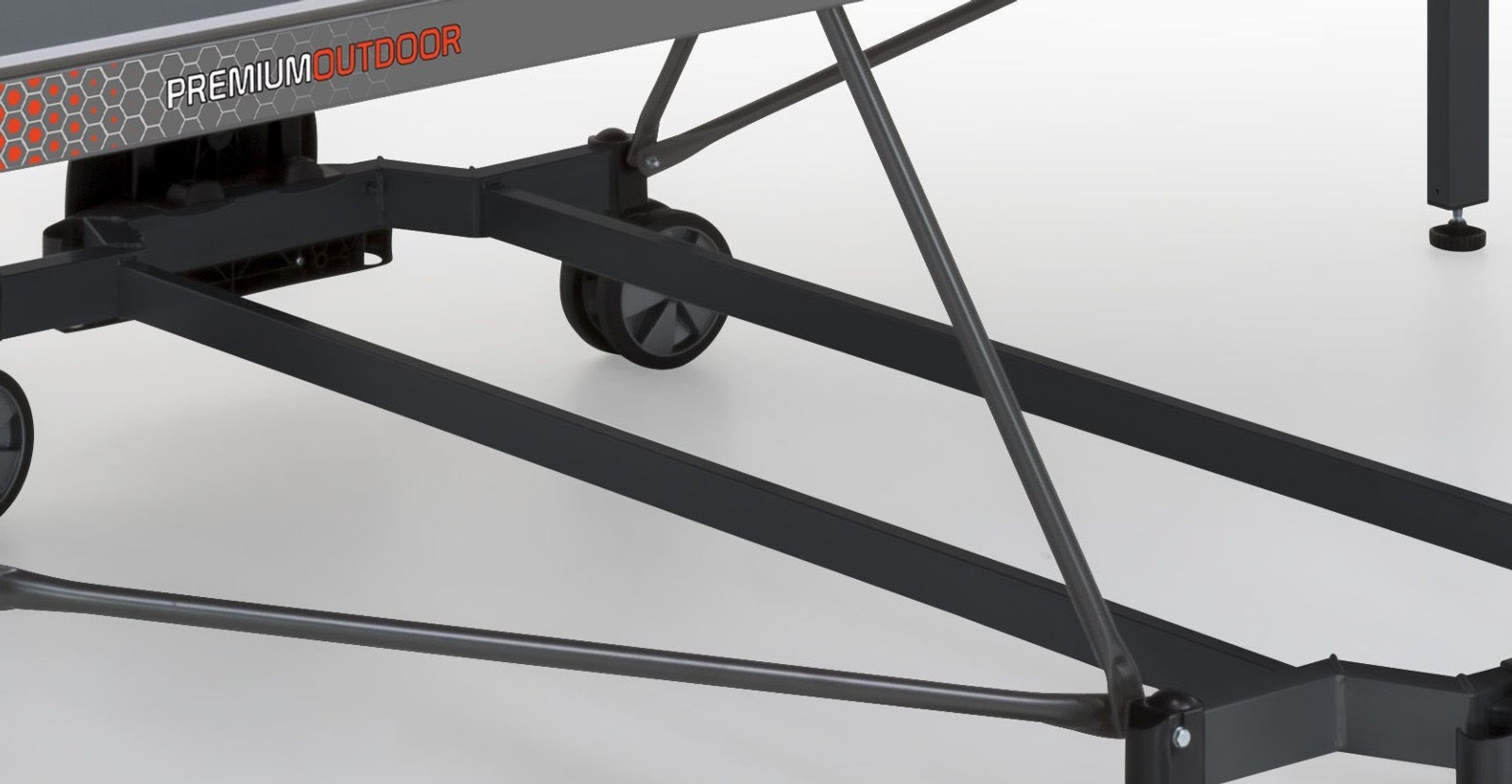 Estremamente stabile, grazie alla struttura con gambe quadrate e barre di collegamento Premium Outdoor si piega e si trasporta facilmente grazie alle ruote doppie.